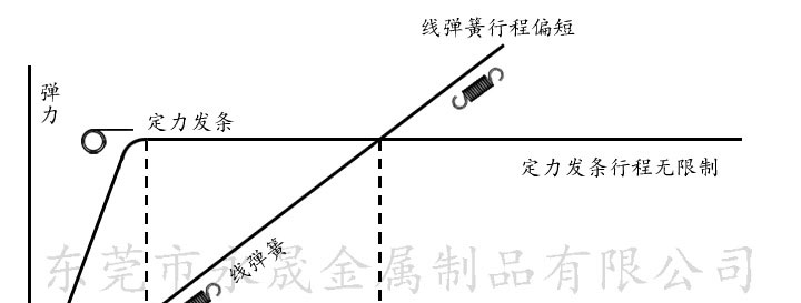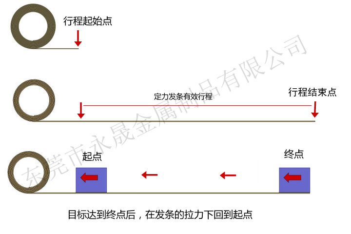 定力发条用不锈钢带卷制而成,通过特定的机器使高强度的钢带定型,当外力将其拉直后,发条会自然卷回并产生弹力,然而达到我们的目标在移位后能回到我们指定的起点。定力发条比传统的线弹簧之优点:所有行程中均保持一定的弹力,预力行程短,即只要较短的行程就可达到所需的弹力,原始长度小于线弹簧,行程无限制。