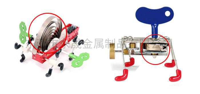 玩具发条又叫动力发条,由钢带卷制而成,依其放松后的形状分为自然形动力发条和预力型动力发条两种,自然形动力发条直接由钢带卷制,预力型动力发条先把钢带定型,再反方向卷成涡卷状,散开后的形状与字母S很象,故也称为S形发条。玩具发条在使用上需有发条盒限制其外径,发条的中心与动力轴相接,当外力使轴与发条产生相对旋转时,发条会卷于动力轴上并储存动能,当外力消失后,发条便产生扭力驱动动力轴,将发条储存的动能通过动力轴输出,相同规格的下比较而言,预力型动力发条能多储25%-40%的扭力,相同空间下能提供更多的转动圈数。