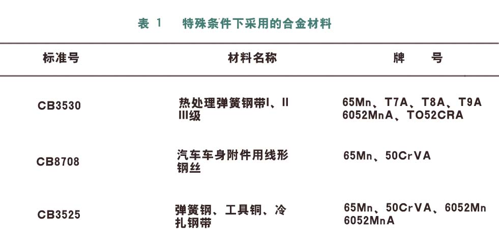 平面涡卷弹簧一般用高碳钢制作,对于有特色要求的场合,也可采用不锈钢、黄铜、青铜或其它耐腐蚀的高弹性合金材料,见表1.