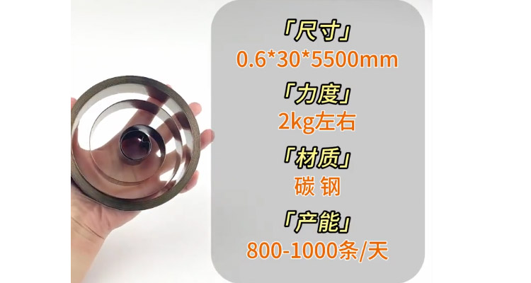 我手里拿的是充电桩发条弹簧,尺寸是0.6*30*5500mm,力度2KG左右,材质是碳钢,产能800-1000条/天。