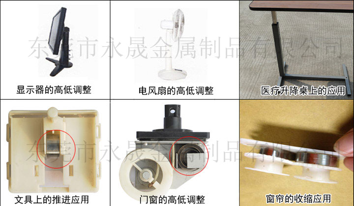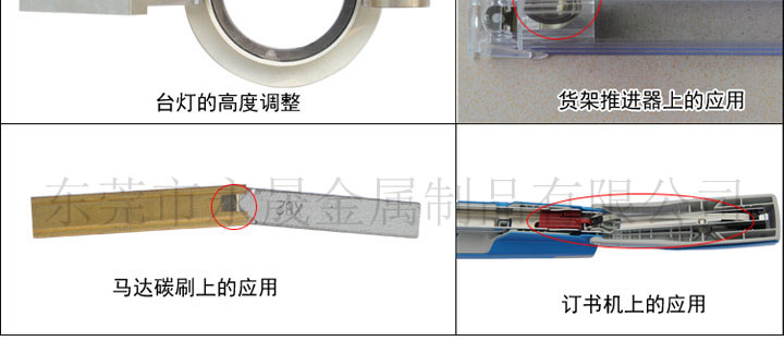 用途:液晶显示屏及风扇的高低调整; 卖场货架及展示架; 窗帘及门窗; 气钉枪及订书机; 马达碳刷;