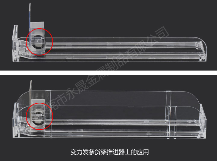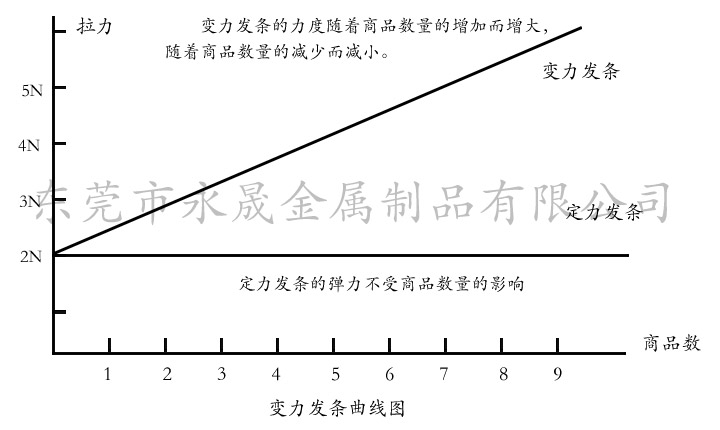 变力发条顾名思义,就是发条力度会有规律的产生变化,突破定力发条拉力不能变化的限制,按客户实际使用上的具体要求,设计发条不同行程的拉力,变力发条同定力发条的最大区别就是可以按要求设计发条不同行程段的拉力,这就解决了卖场货架对一些易变形货物的特殊要求,比如十盒香烟为一组,在十盒烟的位置发条拉力最大,如果保持这个拉力,当香烟减少到只剩几盒时,会因为拉力太大而使香烟变形;但是变力发条可以每减少一盒烟拉力都会变小,在一盒烟的位置拉力最小,这样的作用是在任何位置发条作用在香烟上的拉力都稳定在一定的范围内,保证香烟不会变形。